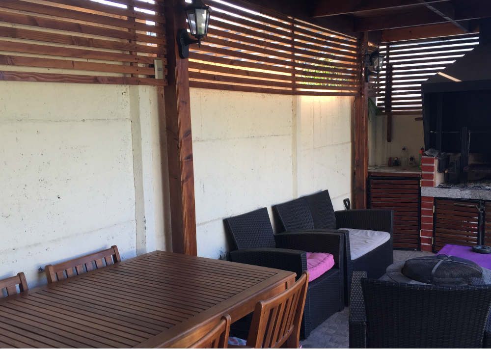 Terraza con piso cerámica diseño, pérgola y quincho. Jardín formado Piscina