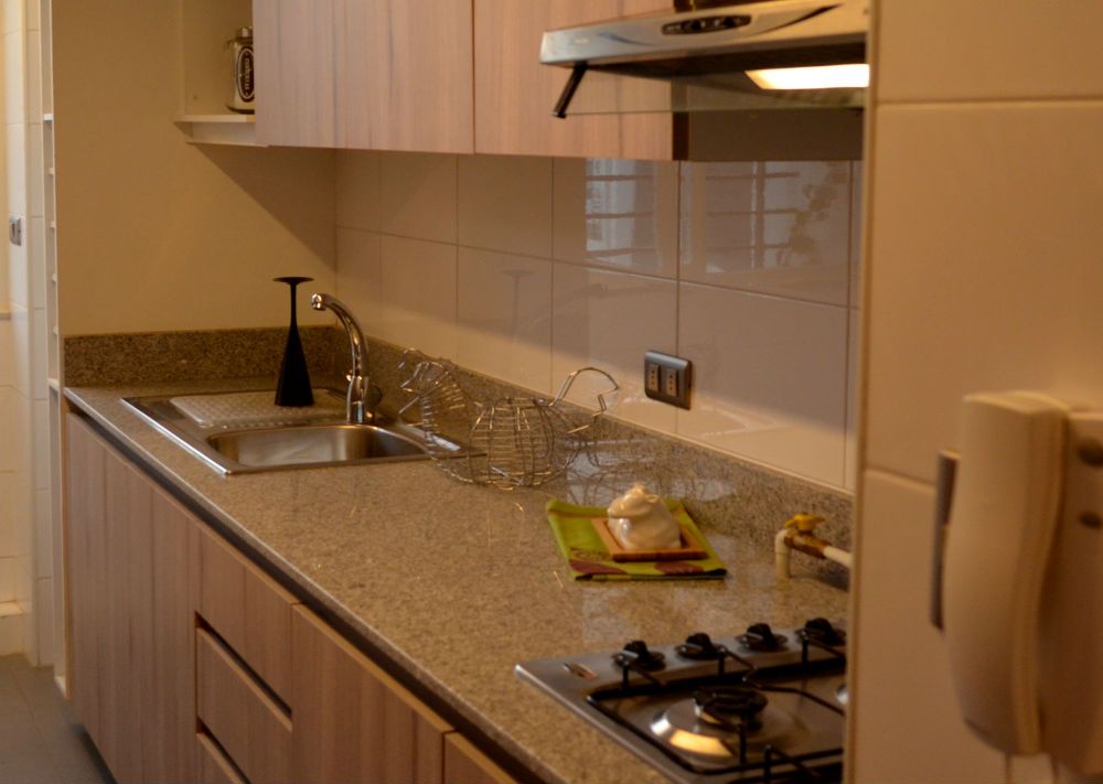 Cocina amoblada y equipada con encimera, horno y campana, mueble con cubierta de granito, ventilación y agradable Luz natural.