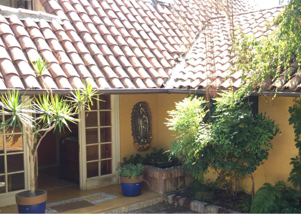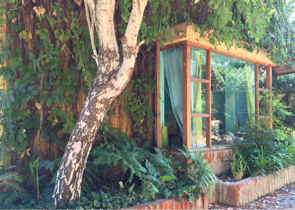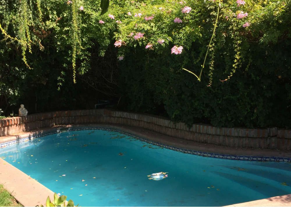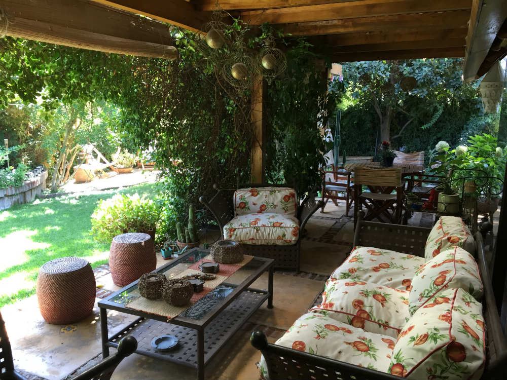Terraza completa del ancho de la propiedad, encantadores espacios, vegetación formada, piscina, bodega.