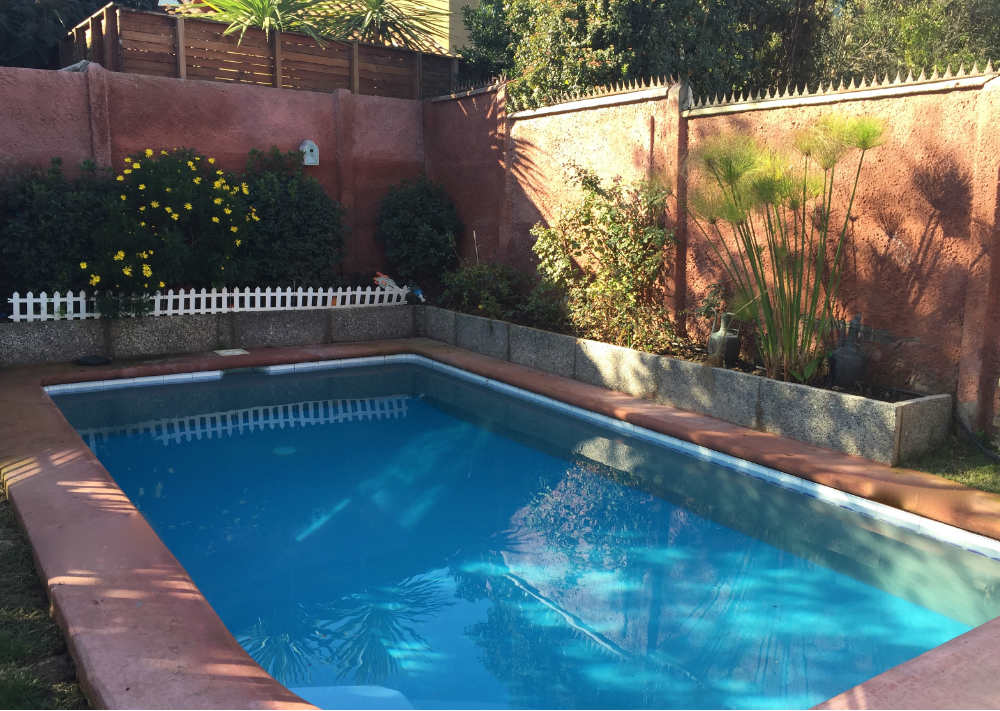 Dormitorio Servicios, logia , piscina, pérgola , asadera, jardín formado.-